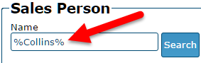 - Search for the salesperson. NOTE: You can search for a string of text anywhere in the Name field by placing a "%" symbol in front of and behind the text you are searching for.