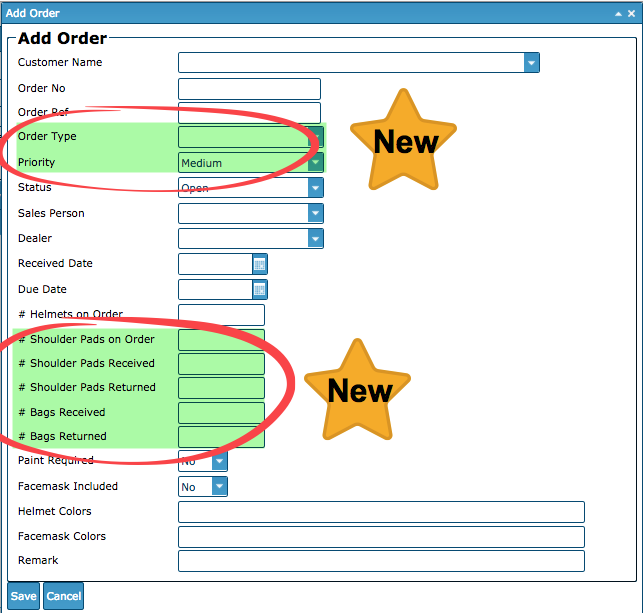 - Shoulder Pads - You can now track the number of shoulder pads that were written on the order, the number of pads received from the customer, and the number of pads returned to the customer.