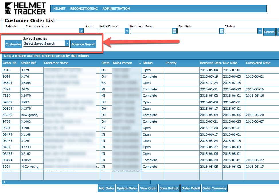 The good news: We are actively testing some new capability that will allow you to select the fields you want, as well as arrange the columns the way you like them. This means you can have different formats and improve the way you use your information. In addition, we are going to add a feature called "Advance Search". This will allow you to create many different search screens (e.g. I want to have a screen that (1) shows all orders past due, (2) show me all orders by a specific salesperson or state, or (3) show all open orders that have shoulder pads). You will quickly recognize the value of this feature when you incorporate more workflow into your process, using the Helmet Tracker technology.