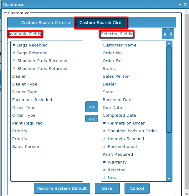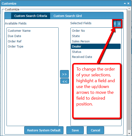 This function allows the user to customize both the fields and their display order in both the Search Criteria (top) and Search Grid (lower) areas.