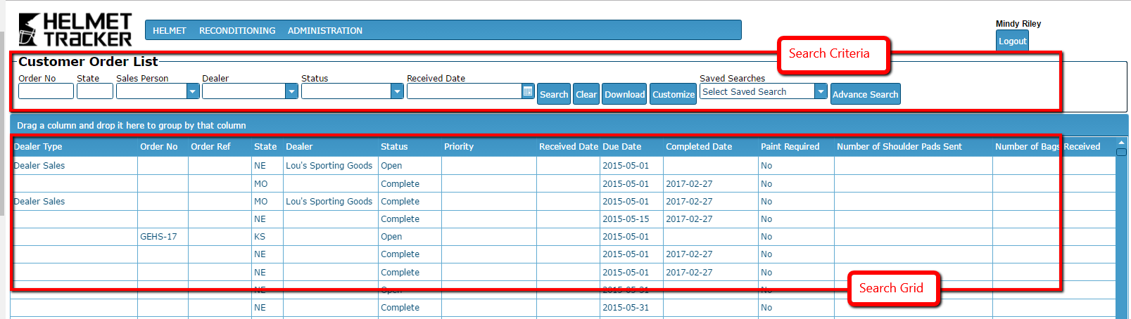 Search Criteria (top of the screen) and Search Grid (middle of the screen).
