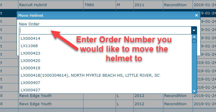 Move Helmet box will appear. (You can start entering Order number and then use the drop-down box to select which order you would like to move the helmet to):