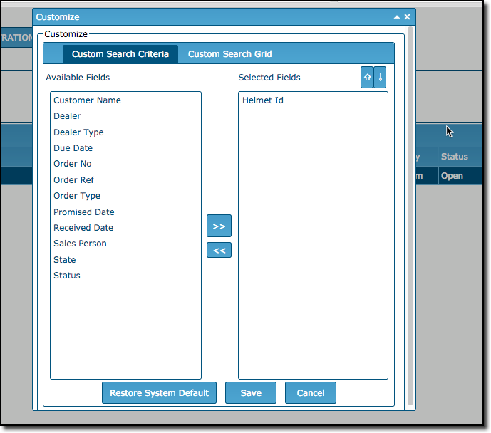 Note: Remember you can use the Customize function to add, change or remove search fields, add, change, remove, or arrange the order of your Search Grid fields. These defined by user, meaning each person can have their own, preferred settings based on how they work and what they need. See below.