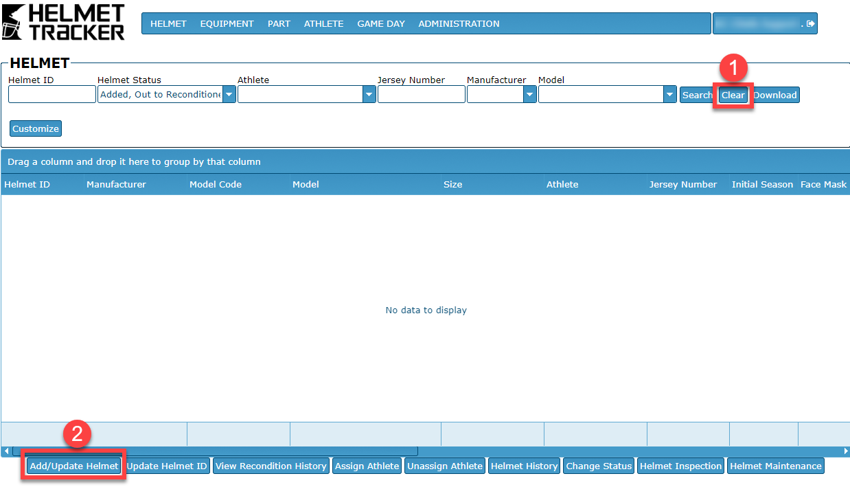 - On the HELMET screen, select the Clear button to make sure you do not have an existing helmet selected. If an existing helmet is selected, you will be editing that helmet instead of adding a new helmet.