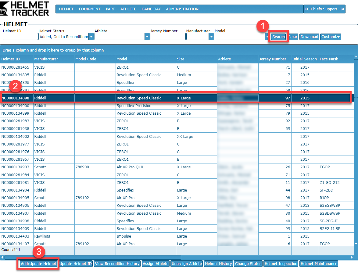 - On the HELMET screen, enter your search criteria and select the Search button to find the helmet you would like to update.