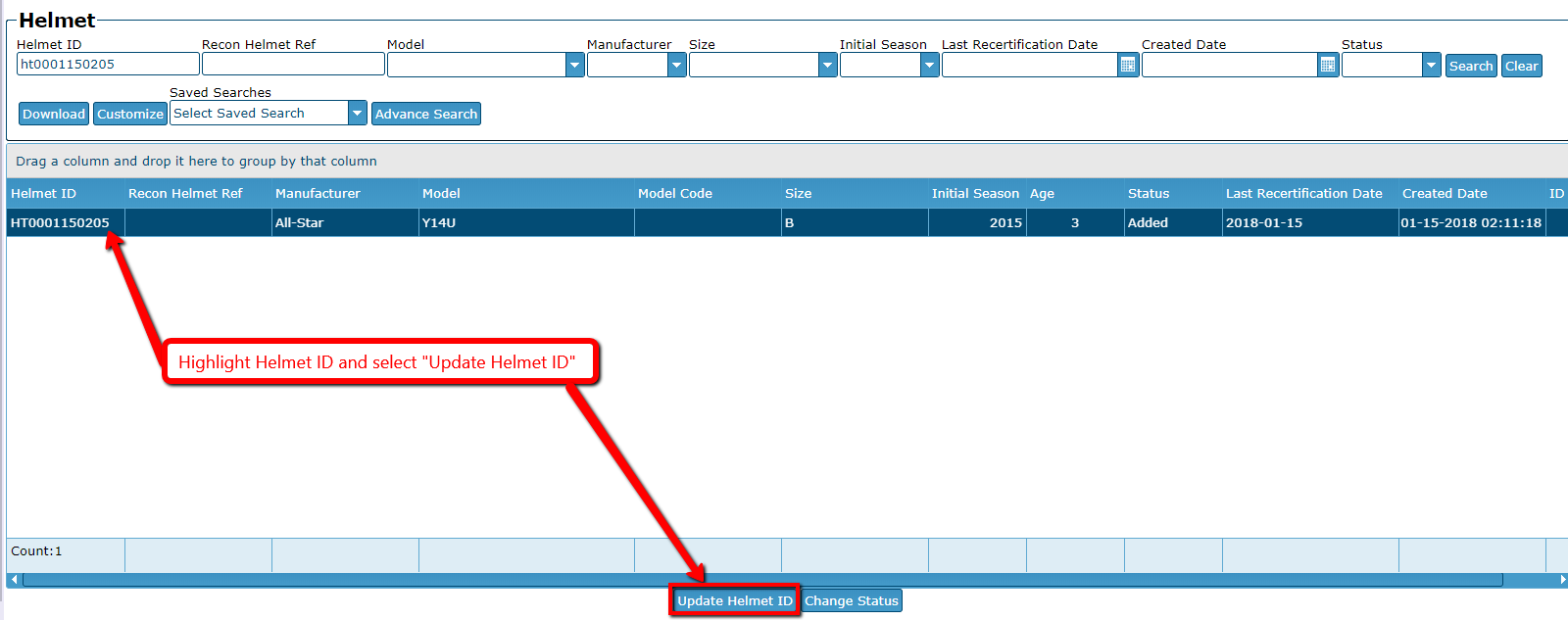 Highlight appropriate helmet and select Update Helmet ID.