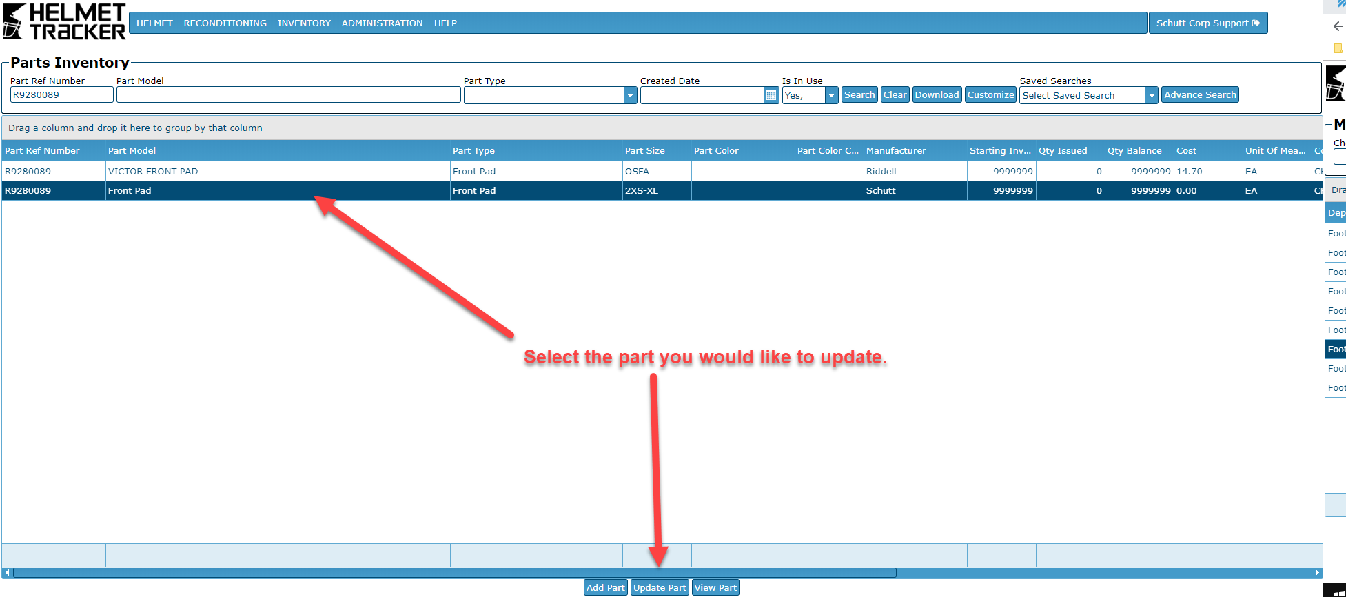 Select the part from the Parts Inventory screen. Then select "Update Part".