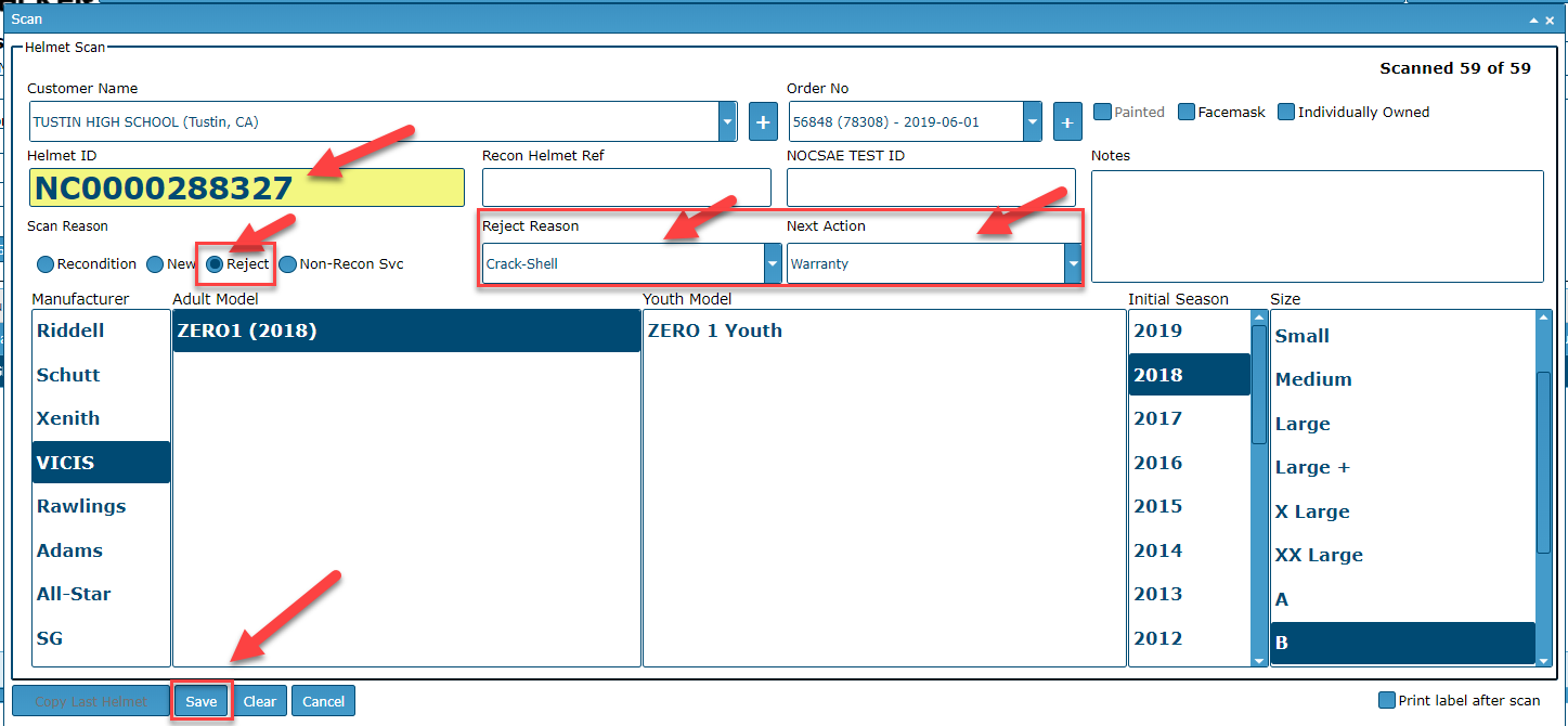 Select the Reject radio button. Then select Crack-Shell as the Reject Reason; then select Warranty as the Next Action. Save.