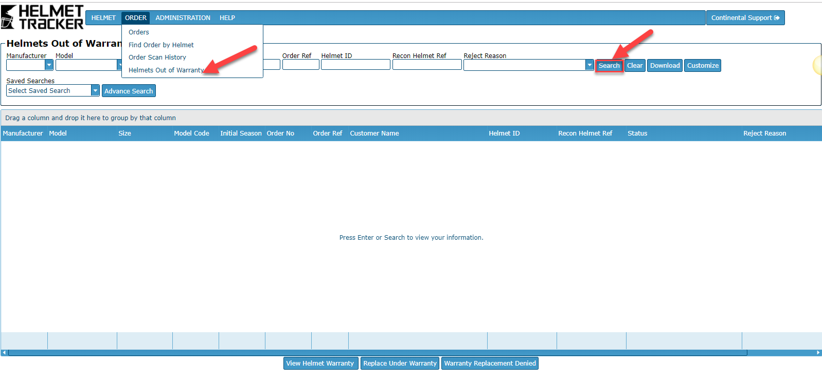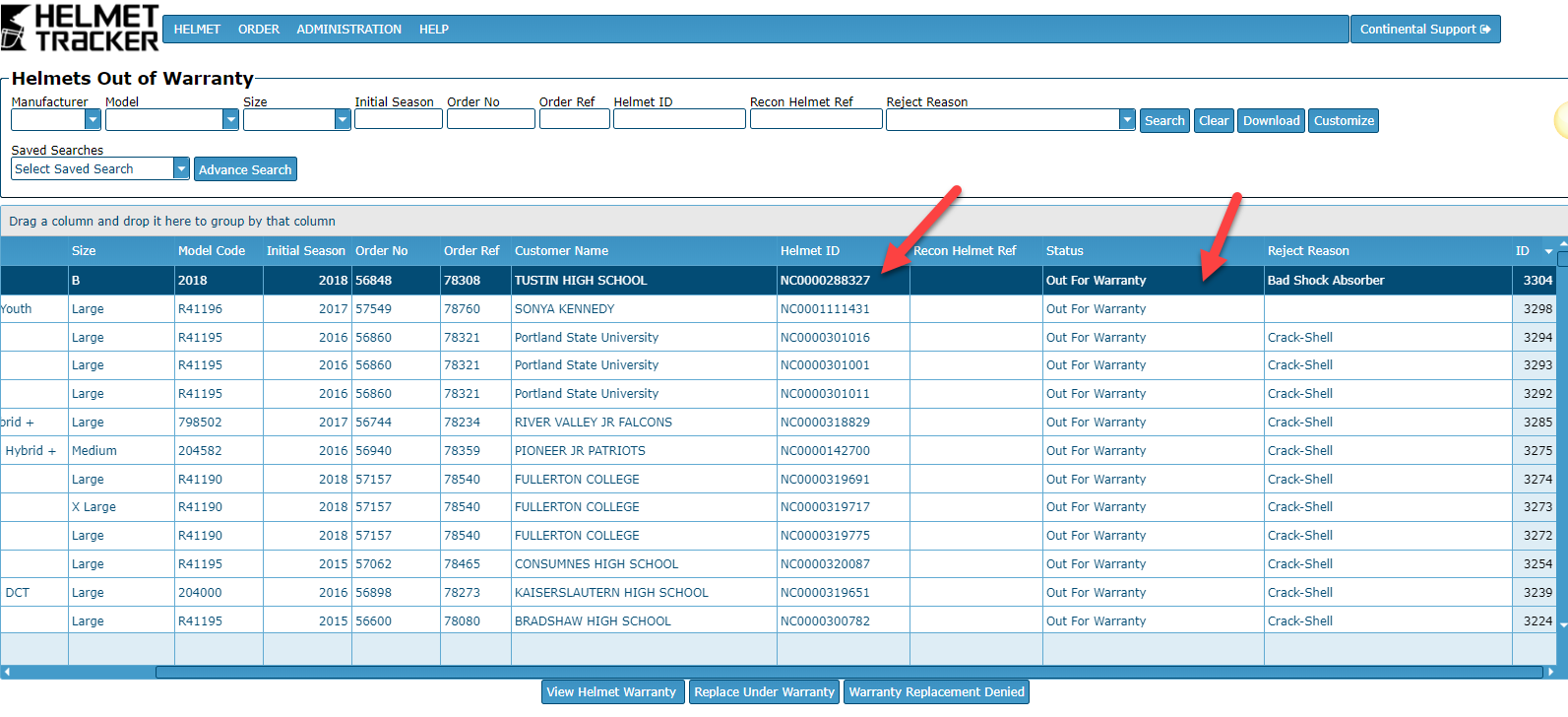 Then the helmet shows up on the Helmets Out for Warranty screen located under Order tab.